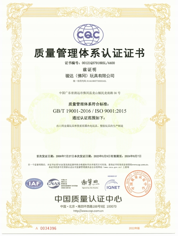骏达(佛冈)玩具有限公司,创于2005年3月,地处广东佛冈,厂房广袤,达三万平米。乃骏达玩具集团之属,系港资之企。以市场为导向,致力于为客户提供产品工程技术研发、工艺设计等研发服务及产品制造(涵盖塑胶、电动、金属、车缝、毛绒、遥控等玩具及电子产品、塑胶制品、收藏品、动漫科技及时尚产品等)。