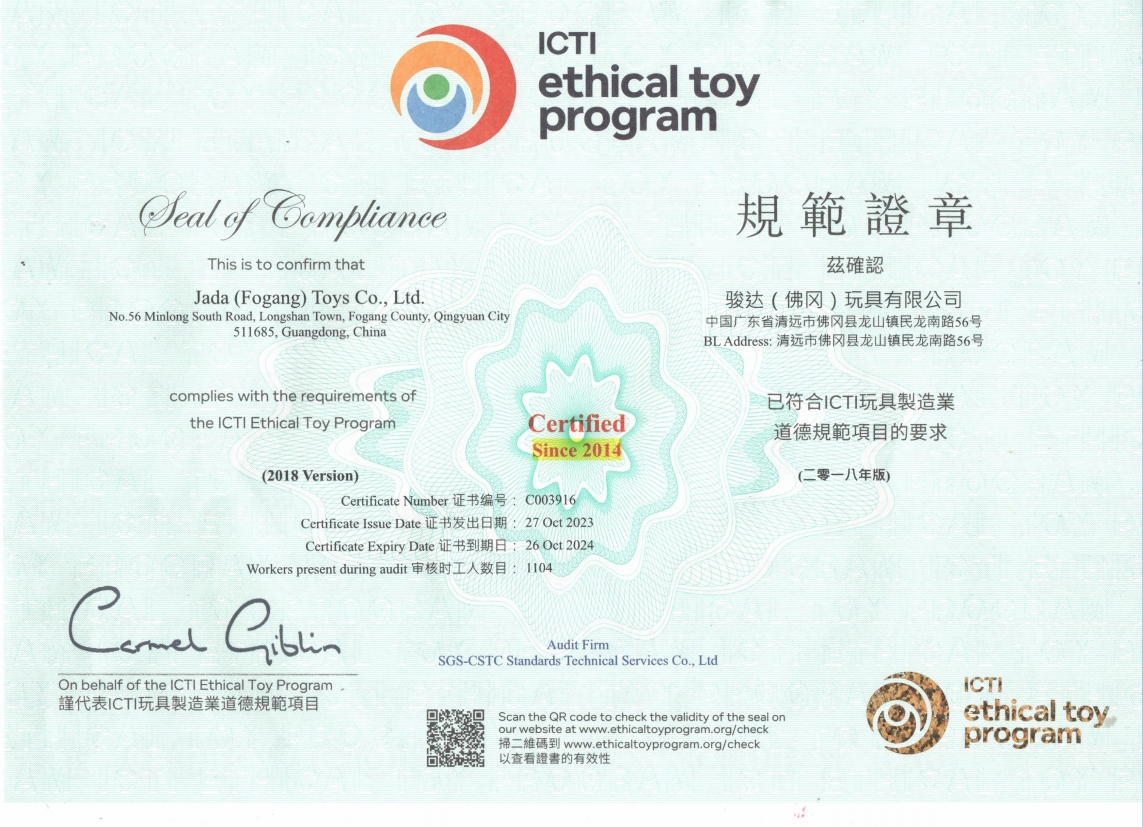本公司获得的认证证书有: ISO9001:2015质量管理体系认证、ICTI社会责任认证、SCAN反恐认证、CNAS国家实验室认证、海关AEO高级认证。